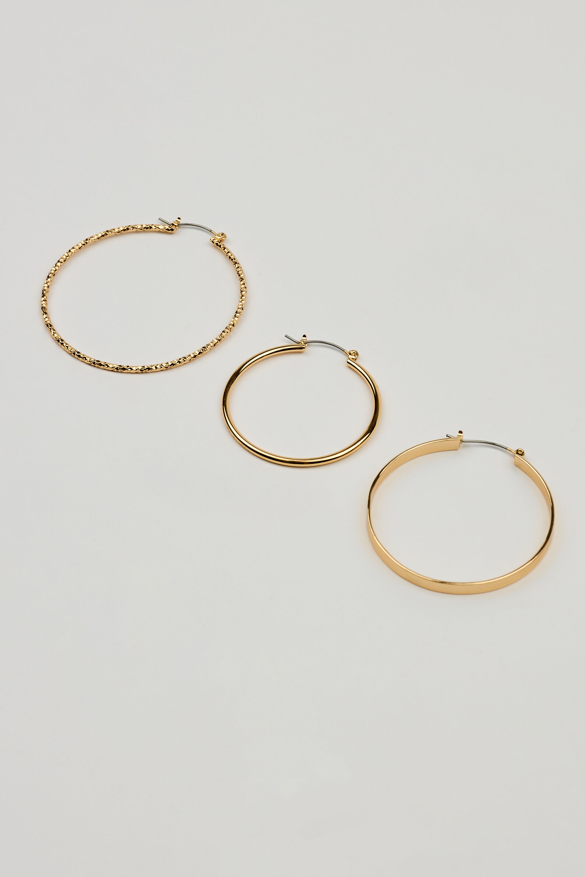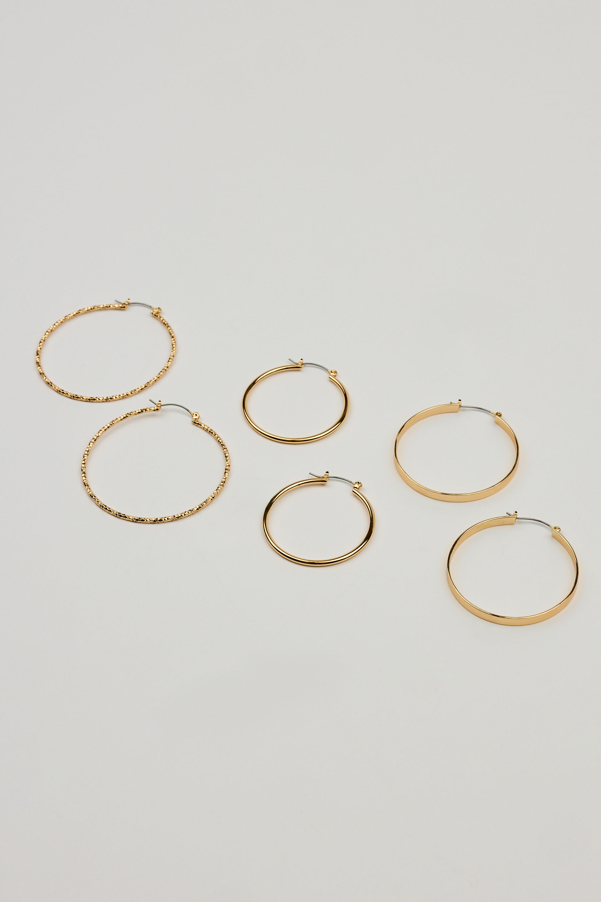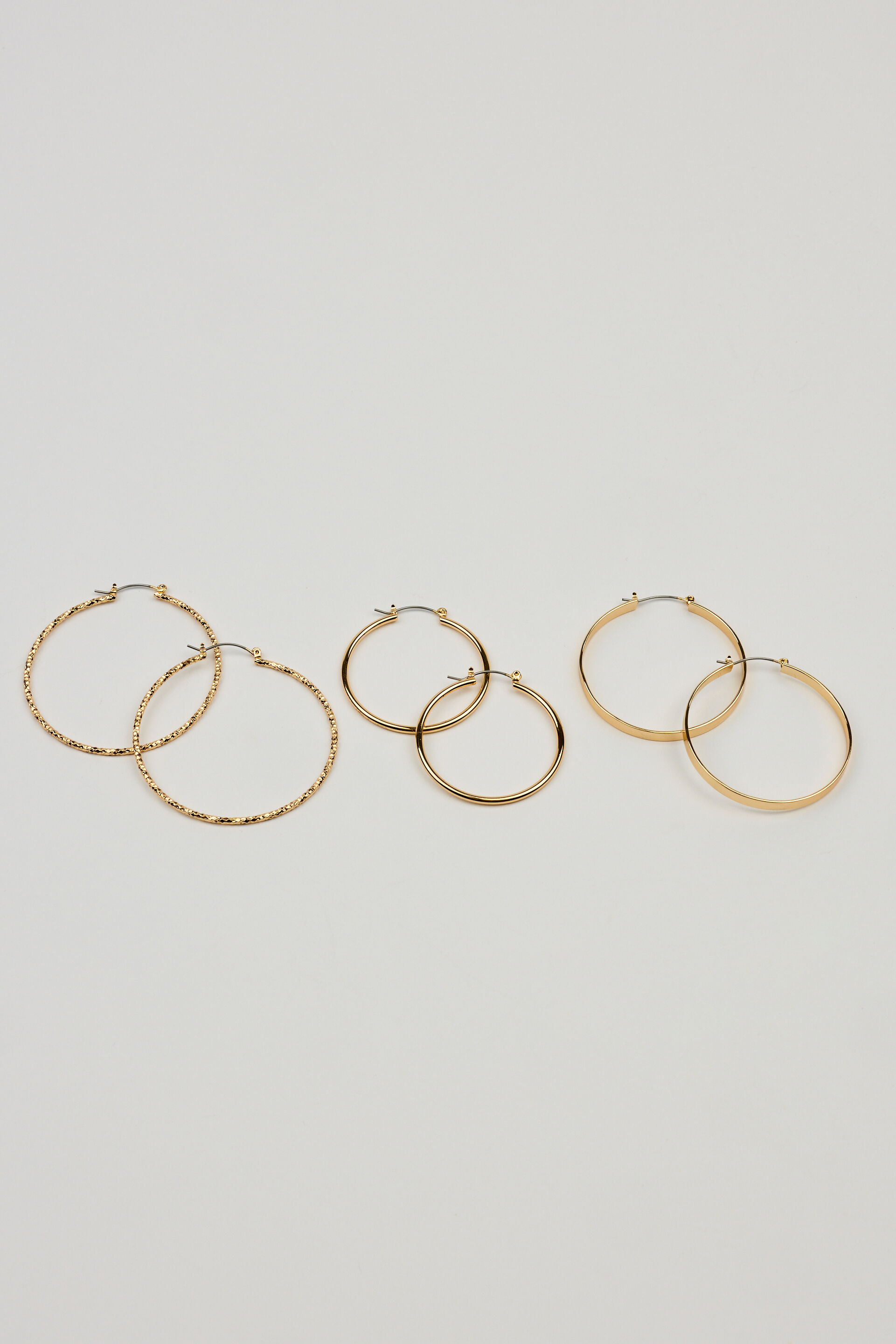 3 Pack Smooth & Textured Hoop Earrings Yellow women – Born to hoop. Features Set of 3 pairs Sculptural hoop earrings Bullet backing Metal costume jewelry All jewelry is lead, nickel, and cadmium free Imported