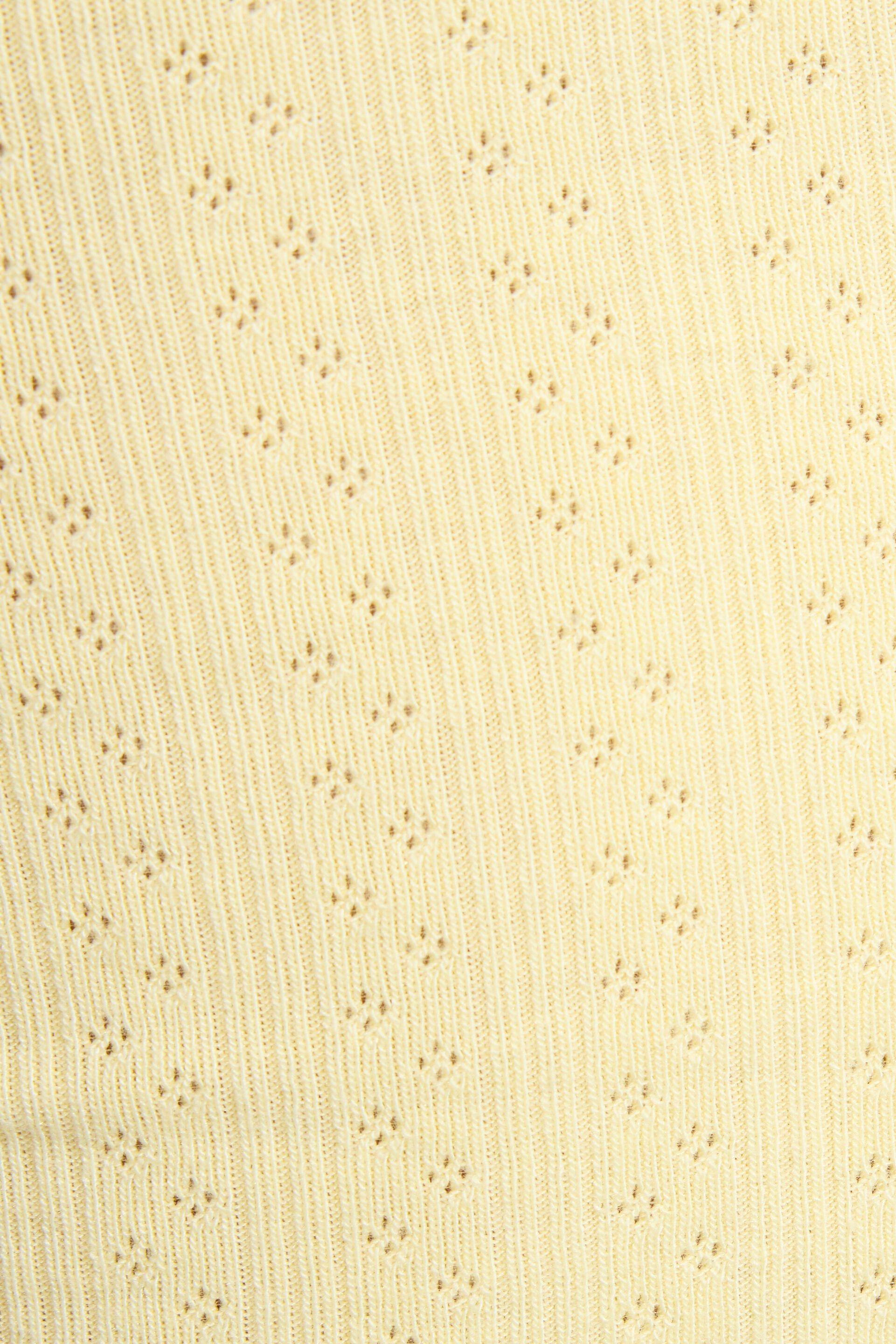 Tiny Pointelle Lettuce Edge Shorts Yellow women – Too hot to go to bed! Features Semi-sheer Pointelle detailing throughout Bow appliqu é at front waistband Mock button fly Lettuce edge hem Stretchy Size & Fit Length: Mini Rise: 8.5